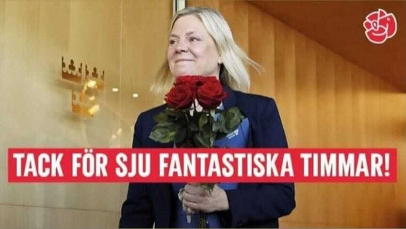 Sverige får sin första kvinnliga statsminister någonsin när Socialdemokraten Magdalena Andersson godkänns av riksdagen, men det goda varar bara i några timmar, för redan samma dag tvingas hon begära entledigande av talmannen efter att Miljöpartiet hoppat av regeringssamarbetet.